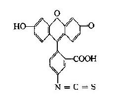1.异硫氰酸荧光素(fluoresceinisothiocyanate,FITC)为黄色或橙黄色结晶粉末,易溶于水或酒精等溶剂。分子量为389.4,最大吸收光波长为490495nm,最大发射光波长520530nm,呈现明亮的黄绿色荧光,结构式如下: