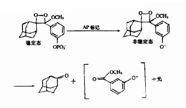 在以AP为标记酶的CLEIA中,应用的底物为adamantyldioxetasephosphate,有不少衍生物的商品试剂如PPD可供应用。发光反应的反应式如下: