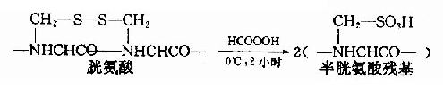用氧化剂过甲酸断裂-S-S-。这个反应一般在0℃下进行2小时左右,两个S就全部能转变成磺酸基,这样被氧化的半胱氨酸称为磺基丙氨酸。