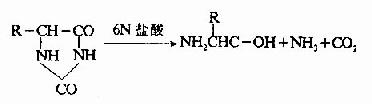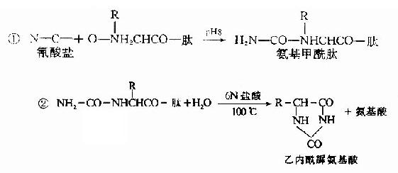 由于乙内酰脲氨基酸不带电荷,因此可用离子交换层析法将它与游离氨基酸分开,分离所得的乙内酰脲氨基酸再被盐酸水解,重新生成游离的氨基酸,鉴别此氨基酸即可了解N-末端是何种氨基酸。