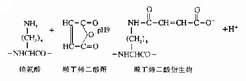 顺丁烯衍生物在中性pH下稳定,胰蛋白酶水解仅使Arg键断裂。在酸性条件下顺丁烯衍生物可脱去封闭,此时再行胰蛋白酶水解,则得赖氨酸为末端的多肽。下述为蛋白质中的赖氨酸,经顺丁烯酰化作用后,被胰蛋白酶水解的例子。