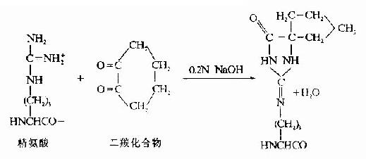 (2)精氨酸的修饰。精氨酸与1,2-和1,3-二羰化合物作用,缩合产物是一杂环化合物,十分稳定。然后胰酶水解仅断裂赖氨酸残基末端的肽键