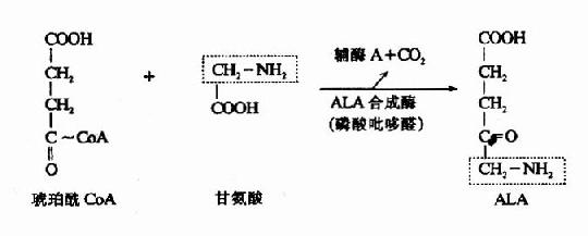 1.δ-氨基-γ-酮戊酸(δ-aminplevulinicacid,ALA)的生成:在线粒体中,首先由甘氨酸和琥珀酰辅酶A在ALA合成酶(ALa synthetase)的催化下缩合生成ALA。ALA合成酶由两个亚基组成,每个亚基分子量为60,000。其辅酶为磷酸吡哆醛。此酶为血红素合成的限速酶,受血红素的反馈抑制。