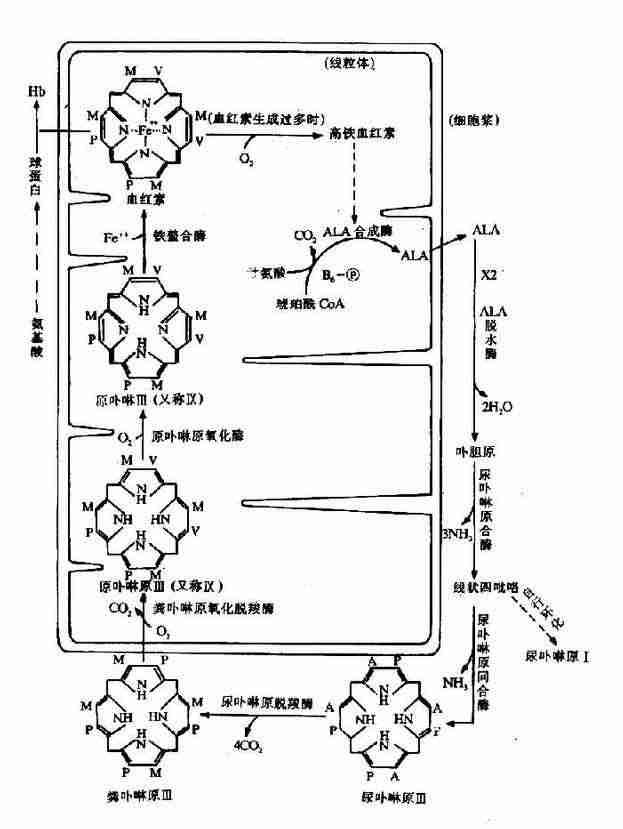 血红素合成的基本原料是甘氨酸、琥珀酰辅酶A及Fe++。合成的起始和终末过程均在线粒体,而中间阶段在胞液中进行。合成过程分为如下四个步骤:
