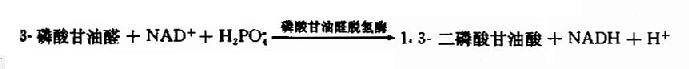 此反应由3-磷酸甘油醛脱氢酶(glyceraldehyde 3-phosphatedehydrogenase)催化3-磷酸甘油醛氧化脱氢并磷酸化生成含有1个高能磷酸键的1,3-二磷酸甘油酸,本反应脱下的氢和电子转给脱氢酶的辅酶NAD+生成NADH+H+,磷酸根来自无机磷酸。