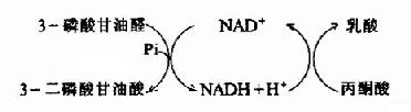 氧供应不足时从糖酵解途径生成的丙酮酸转变为乳酸。缺氧时葡萄糖分解为乳酸称为糖酵解(glycolysis),因它和酵母菌生醇发酵非常相似。丙酮酸转变成乳酸由乳酸脱氢酶(lactatedehydrogenase)催化丙酮酸乳酸脱氢酶乳酸在这个反应中丙酮酸起了氢接受体的作用。由3-磷酸甘油醛脱氢酶反应生成的NADH+H+,缺氧时不能经电子传递链氧化。正是通过将丙酮酸还原成乳酸,使NADH转变成NAD+,糖酵解才能继续进行。