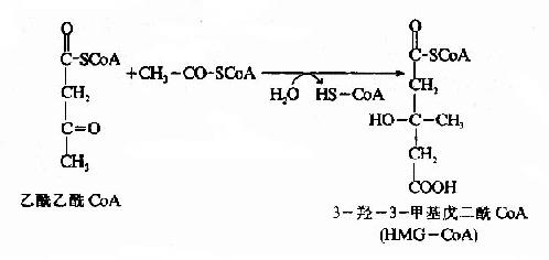 在3-羟-3-甲基戊二酰CoA(hydroxy methyl glutarylCoA,HMGCoA)合成酶催化下,乙酰乙酰CoA再与一分子乙酰CoA反应,生成HMGCoA,并释放出一分子辅酶。这一步反应是酮体生成的限速步骤。