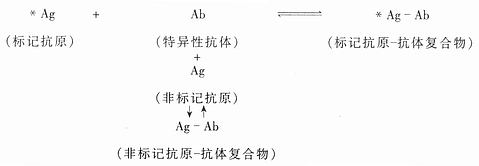 RIA的基本原理,是利用标记抗原(*Ag)和非标记抗原(Ag)对特异性抗体(Ab)发生竞争性结合。竞争结合反应可用下式表示: