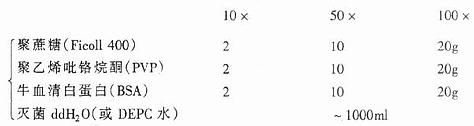 配制:先称取上述两种试剂,溶于约800ml ddH2O中,滴加10N的NaOH,将pH值调至7.0,补足ddH2O至1000ml,加入终浓度为0.1%~0.2%的DEPC,分装后高压灭菌,可室温保存。