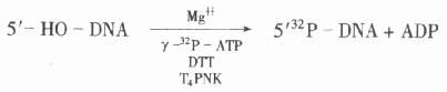 在大肠杆菌T4噬菌体多聚核苷酸激酶(T4PNK)的催化下,将γ-32P-ATP上的磷酸连接到寡核苷酸的5’末端上。要求标记的寡核苷酸5’端必须带羟基。反应式为:
