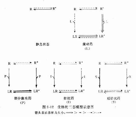 为什么化学结构类似的药物作用于同一受体有的是激动药,有的是拮抗药,还有的是部分拮抗药?还可用二态模型(two-statemodel) 学说解释。按此学说,受体蛋白有两种可以互变的构型状态:静息状态(R)与活动状态(R*)(图2-12)。静息时平衡趋向R。活动药只与R*有较大亲和力,L-R*结合后充分发挥药理效应。部分激动药(P)与R及R*都能结合但对R*的亲和力大于对R的亲和力,故只有部分受体被激活而发挥较小的药理效应。拮抗药对R及R*亲和力相等,且能牢固结合,但保持静息状态时两种受体状态平衡,拮抗药不能激活受体但能阻断激动药作用。个别药物(如苯二氮