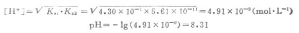 例4 计算0.10mol.L-1NaHCO3溶液的pH值。已知H2CO3的Ka1=4.30*10-7,Ka1=5.61*10-11。