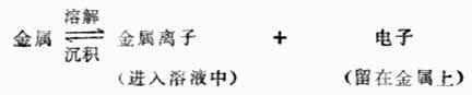 金属晶体是由金属原子、金属离子和自由电子组成的。当把金属插入其盐溶液中时,金属表面的离子与溶液中极性水分子相互吸引而发生水化作用。这种水化作用可使金属表面上部分金属离子进入溶液而把电子留在金属表面上,这是金属溶解过程。金属越活泼,溶液越稀,金属溶解的倾向越大。另一方面,溶液中的金属离子有可能碰撞金属表面,从金属表面上得到电子,还原为金属原子沉积在金属表面上。这个过程为金属离子的沉积。金属越不活泼,溶液浓度越大,金属离子沉积的倾向越大。当金属的溶解速度和金属离子的沉积速度相等时,达到了动态平衡。