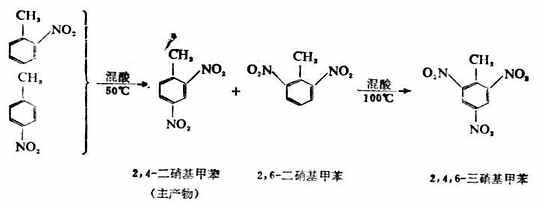 如果反应温度为50℃时,邻及对硝基甲苯继续硝化,主要得2,4-二硝基甲苯,后者在100℃时进一步反应,生成2,4,6-三硝基甲苯(INT),它是一种重要的炸药。