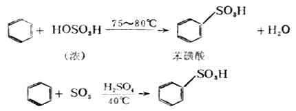 (3)磺化反应 苯与浓硫酸在75-80℃或发烟硫酸(SO3+浓H2SO4)在40℃时反应。苯环上的氢原子被磺酸基(-SO3H)取代,生成苯磺酸。