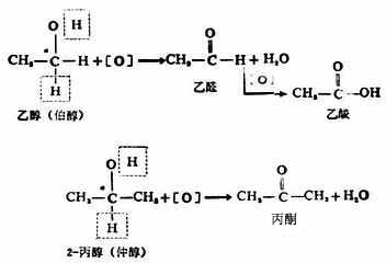 醇分子中的α碳原子上若有氢原子时,该氢原子受羟基的影响,比较活泼易于被氧化。用高锰酸钾或重铬酸钾加硫酸等氢氧化剂氧化为相应的醛或酮。例如,伯醇氧化生成醛,醛继续氧化生成羧酸;仲醇氧化生成酮。叔醇在同样条件下不易被氧化。