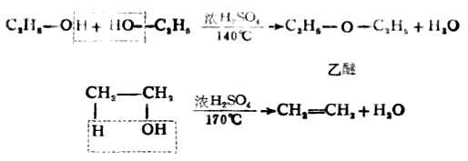 醇与浓硫酸共热发生脱水反应,产物随反应条件及醇的类型而异在较高温度下,主要发生分子内的脱水(消除反应)生成烯烃;而在稍低温度下,则发生分子间脱水生成醚。
