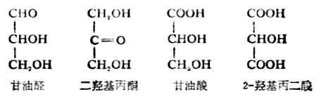 此外,对多元醇分子来讲,由于一种反应可在不同位置的羟基上进行,也可在几个羟基上同时进行,所以往往可得到多种没的产物。如丙三醇氧化就会生成各种氧化产物的混合物,例如: