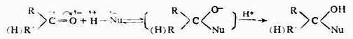 同碳碳双键一样,羰基中的碳氧双键也是由一个σ键和一个π键所组成,所以醛、酮都易发生加成反应。但和烯烃的亲电加成不同,羰基的加成属于亲核加成。由于氧原子的电负性大于碳原子,使羰基发生极化,氧原子带有部分负电荷,碳原了带有部分正电荷。一般说来,带负电荷的氧比带正电荷的碳较为稳定。所以,当羰基化合物发生加成反应时,首先是试剂中带负电荷的部分加到羰基的碳原子上,形成氧带负电荷的中间体,然后试剂中带正荷部分加到带负虵荷的氧上。这种由亲核试剂(能提供电子对的试剂)进攻而引起蝗加成反应叫做亲核加成反应。这类加反应可用于下式表示: