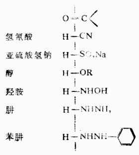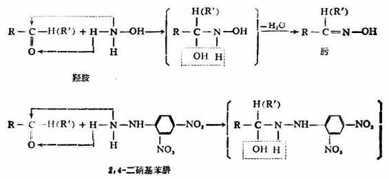 醛和酮可以与氢氰酸、亚梳酸氢钠、醇、氨的衍生物(如羟胺、肼等)试剂起加成反应。在反应产物中都是试剂中的氢与羰基上的氧相连接,其余部分与羰基的碳相连。