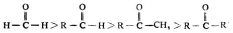 对于同一种亲核试剂,亲核加成的难易取决于羰基碳原子所带正电荷的强弱及位阻效应的大小。所谓位阻效应是指分子中相邻的原子或原子团,在空间所占的体积和位置而产生的影响。羰基碳原子所带正电荷越多,反应越容易进行;羰基上连接的烃基越大则位阻效应越大,亲核试剂就越不容易靠近,反应也就越不容易进行。酮的羰基和两个烃基相连,由于烷基的斥电子作用,降低了羰基碳原子的正电荷;另一方面酮的两上烃基增大了位阻效应,所以在许多亲核加成反应中,酮一般不如醛活泼。醛、酮亲核加成反应活泼性顺序排列如下:
