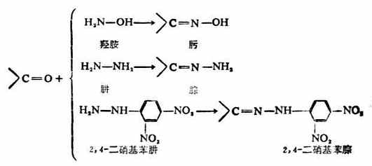 醛、酮与2,4-二硝基苯肼作用生成的2,4-二硝基苯腙是黄色结晶,具有一定的熔点,反应也很明显,便于观察,所以常被用来鉴别醛、酮。其它反应的产物肟、腙大都也是具有一定熔点的晶体,亦可用来鉴别醛、酮。因此,把这些氨的衍生物称为羰基试剂(即检验羰基的试剂)。