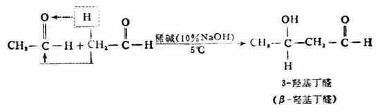含有氢原子的醛在稀碱的作用下,一分子醛的α氢原子加到另一分子醛的羰基氧原子上,其余部分加到羰基的碳原子上,生成既含有羟基又含有醛基的β-羟基醛(醇醛),这个反应称为羟醛缩合或醇醛缩合。例如: