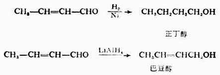 醛、酮与氢化铝锂(LiALH4)、硼氢化钠(NaBH4)或异丙醇铝(AL[OCH(CH3)2]3)作用,也都还原生成相应的醇。这些还原剂具有较高的选择性,只能还原羰基,而不影响分子中的碳碳双键等其它可被催化氢化的基团。例如,巴豆醛若用镍催化氢化则得到正丁醇,而用LiALH4还原可以得到巴豆醇。 >