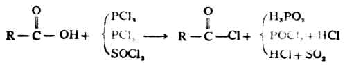 羧酸(除甲酸外)能与三卤化磷、五卤化磷或亚硫酰氯(SOCL2)反应,羧基中的羟基被卤素取代生成相应的酰卤。