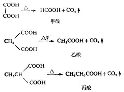 乙二酸或丙二酸加热脱羧生成一元羧酸。