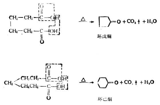 己二酸、庚二酸与氢氧化钡共热时,既失水又脱羧 ,生成环酮。