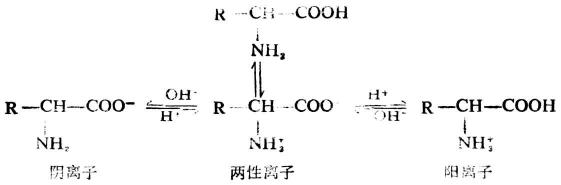 若将氨基酸的水溶液酸化,则两性离子与H+结合而成阳离子,若加碱于氨基酸的水溶液中,则两性离子中氮原子上的一个氢离子与OH-结合成水,而两性离子变成阴离子。