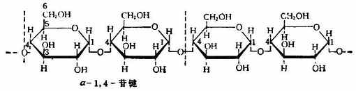 纯的糖淀粉不易溶于冷水,在热水中不成糊状。糖淀粉的相对分子质量约为150000-600000,它是由许多D-葡萄糖单位通过α-1,4-苷键连接而成的链状化合物。