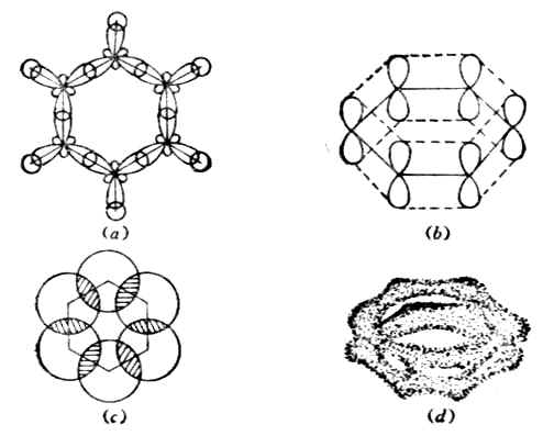 经过现代物理方法的研究,证明苯分子中的六个碳原子都是sp3杂化的。每个碳原子各以两个sp2杂化轨道分别与另外两个碳原子形成C-Cσ键。这样六个碳原子构成了一个正六边形的环状结构。每个碳原子上的另一个sp2轨道,其电子云的对称轴在正六边形的平面上,这个sp2杂化轨道与氢原子的1s轨道,其电子云的对称轴在正六边形的平面上,这个sp2杂化轨道与氢原子的1s轨道形成C-Hσ。因此苯人子中的所有原子都在一个平面上,键角都是120°[图12-(a)],每个碳原子还有一个未参与杂化的pz杂化轨道[图12-(b)],它的对称轴垂直于此平面,能与相邻的两个碳原子上的pz轨道分别从侧面平行重叠,形成了一个闭合的共轭体系[图12-5(c)],在这个体系中,环上有六个碳原子和六个π电子,离域的π电子云完全平均化,体系能量低,比较稳定。π电子云成两个轮胎状[图12-5(d)],均匀分布在苯环平面的上下两侧。苯分子中的碳-碳键长也完全平均化,都是0.1393nm。这种具有6π电子闭合共轭体系,使得苯环具有高度的对称性和特殊的稳定性。由于形成了闭合共轭体系,无单、双键之分,故苯的邻位二元取代物只能有一种。