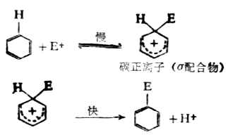 苯及其同系物在苯环上的取代反应,包括卤化、硝化、磺化、烷基化及酰化等,是一个带正电荷的原子或原子团(E+)首先进攻苯环而进行的反应,故是一个亲电取代。它的整个过程用下式表示。