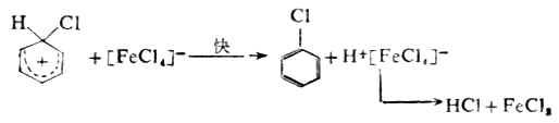 苯与卤素在催化剂(例如FeCL3)存在下的卤化,是由亲电试剂发动进攻的。这个反应的亲电试剂与卤化铁生成的配合物。