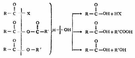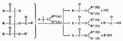酰卤、酸酐和羧酸酯在分子构造上有相似之处,故它们的化学性质相似,都能与水、醇和氨作用而发生水解、醇解和氨解反应。但它们的反应活性不同,以酰卤最活泼,酸酐次之,羧酸酯较不活泼。