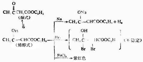 乙酰乙酸乙酯具有酮和羧酸酯的基本性质,能与HCN,NaHSO3,羟胺及苯肼反应,以稀NaOH水解为乙酰乙酸和乙醇。此外,乙酰乙酸乙酯还能使溴溶液裉色,与金属钠作用放出氢气,与FeCL3呈紫红色。这些性质表明乙酰乙酸乙酯还应具有烯醇式构造。