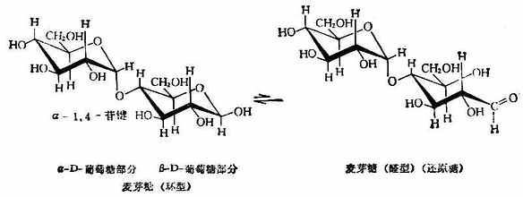 麦芽糖是由一分子α-D-葡萄糖用其半缩醛羟基与另一分子D-葡萄糖C-4上的醇羟基脱水,通过α-1,4-苷键组成的二糖。因此,麦芽糖有变旋现象,能还原费林试剂和吐伦试剂,属于还原性二糖。