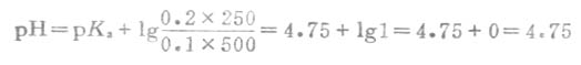 例6 将0.3mol.L-1HOAc溶液10mL与0.1mol.L-1NaOH溶液10mL混合后制成缓冲溶液,试计算这个溶液的pH值(2.5℃时,HOAc时pKa=4.75)。