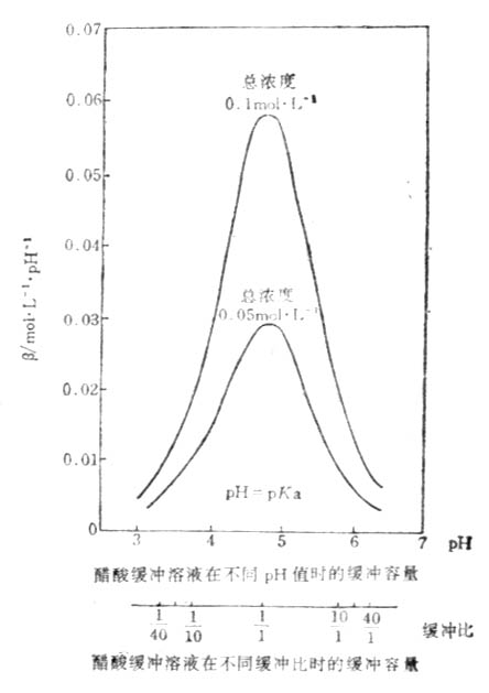 在实际工作中,我们可以通过测量加入强碱的增量Δb(或加入强酸,相对于减少强碱量-Δb),同时测量相应的PH值的增量ΔPH(或加入强酸,PH减小,-ΔPH),从两者比值求得β。因此缓冲容量在数值上等于使1毫升缓冲溶液的PH值改变1个单位时所必须加入的强碱或强酸的物质的量(通常单位用毫摩)。