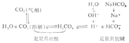 当人体内各组织和细胞在代谢中产生的酸进入血液时,血液中CO2-HCO-3缓冲系的共轭碱HCO-3就和H+反应,并转变为其共轭酸H2CO3及CO2,即上述H2CO3离解平衡向左移动。因碳酸仅轻度离解,所以,等于把加入的H+从溶液中有效地除去,维持PH基本不变。而溶解的CO2转变为气相CO2从肺部呼出。如果代谢产生的碱进入血液,则上述血液中的离解平衡向右移动,从而抑制PH值的升高。而血液中升高的[HCO-3]可通过肾脏功能的调节使其浓度降低。