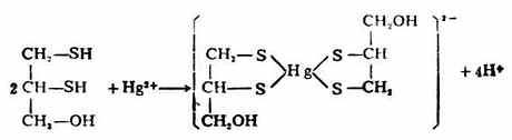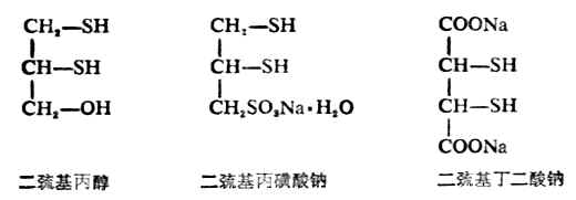 它们均含有两个相邻的巯基,能与砷、汞、锑等金属作用生成稳定无毒的环状化合物。例如: