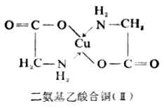 四原子环在螯合物中是不常见的,六原子以上的环也是比较少的。中心离子有一定的电荷数,同时也有一定的配位数。Cu(Ⅱ)带有二个正电荷,它的配位数为4。氨基乙酸根离子(H2N-CH2-COO-)既有氨基氮,都能给出电子对;氨基氮能满足中心离子的配位数,羟基氧则能使配位数和电荷数同时得到满足,因此Cu 2+和两个(H2N-CH2-COO-)螯合后,得到的是中性分子二氨基乙酸合铜(Ⅱ)(简称氨基乙酸酮)[Cu(H2N-CH2-COO)2]由于羟基氧带有负电荷,故它与Cu 2+形成的配键通常用“-”表示。